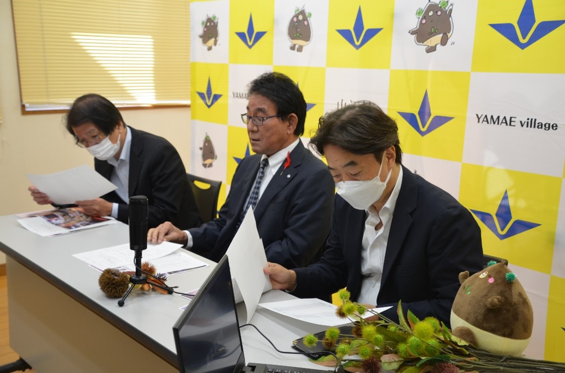 今回は、銀座熊本館から東京事務所次長兼一般社団法人熊本県物産振興協会東京支部次長の山田純子さん、村からはやまえ栗まつり実行委員会委員長の内山慶冶村長、プロジェクトマネジメント推進室の吉無田一成室長、福山武彦地域づくりアドバイザーが出席されました。