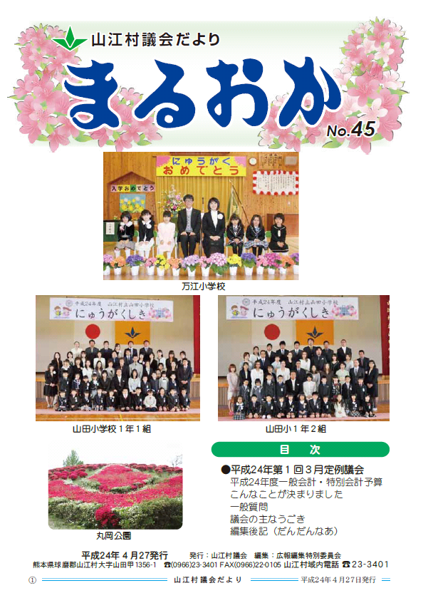 平成24年議会だより「まるおか」 最終更新日:2019年4月1日 印刷 平成24年10月号(47号) 平成24年10月号(47号)ダウンロード (PDF:5.43メガバイト) 平成24年10月31日発行主な内容平成24年第6回山江村議会定例会平成23年度決算の内容補正予算の内容平成24年7月号(46号) 平成24年7月号(46号)ダウンロード (PDF:9.8メガバイト) 平成24年7月31日発行主な内容平成24年第3回山江村議会定例会こんなことが決まりました災害調査報告平成24年4月号(45号) 平成24年4月号(45号)ダウンロード (PDF:1.54メガバイト) 平成24年4月27日発行主な内容平成24年第1回3月定例議会平成24年度一般会計・特別会計予算こんなことが決まりました平成24年1月号(44号) 平成24年1月号(44号)ダウンロード (PDF:5.67メガバイト) 平成24年1月27日発行主な内容新年のごあいさつ12月定例議会こんなことが決まりました