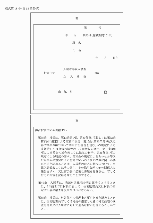 第18条 村長は、条例第35条第2項、第40条第1項及び第55条第1項の規定により入居者の収入調査又は村営住宅の検査を行う者に対し、その身分を示す証票(様式第18号)を交付する。ただし、条例第40条第1項の規定により住宅管理人をして同項の検査を行わせるときは、この限りでない。