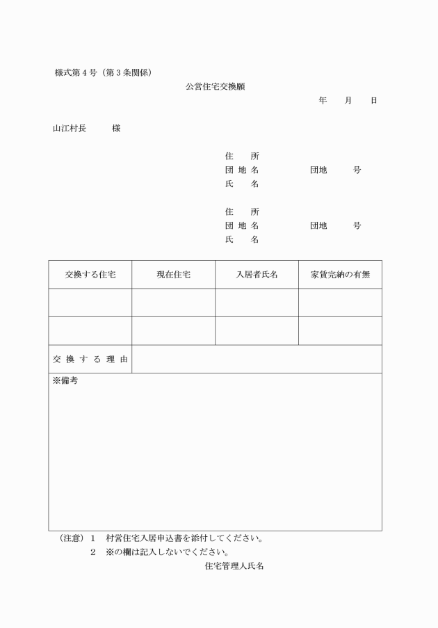 第25条 条例又はこの規則により村長に提出する申請書、届書及び願書等は、当該住宅管理人を経由しなければならない。ただし、入居申込書及び請求書はこの限りでない。