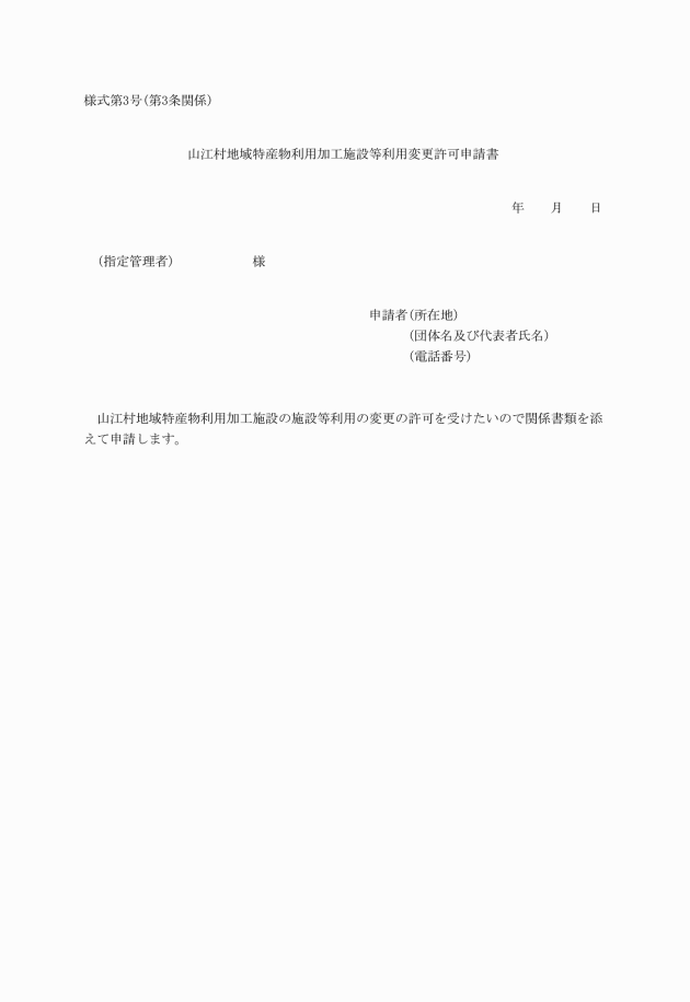 3 条例第13条後段の規定により、施設等の利用の変更の許可を受けようとするものは、様式第3号による利用変更許可申請書を指定管理者に提出しなければならない。