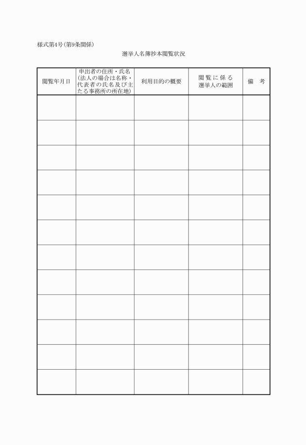 第9条 委員会は、選挙人名簿の抄本の閲覧状況について、毎年1月から12月までの閲覧分について、別途委員会が定める日までに様式第4号により公表するものとする。ただし、選挙人が本人又は当該選挙人と同居している者について選挙人名簿に登録された者であるかどうかの確認を行うためにした閲覧を除く。