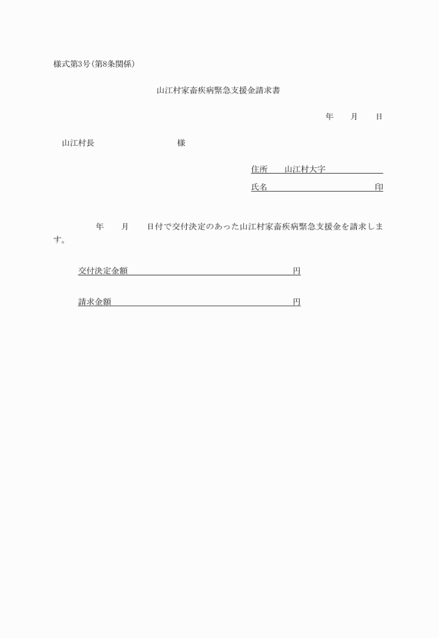 第8条 支援金の請求は、支援金の決定後、山江村家畜疾病緊急支援金請求書(様式第3号)を村長に提出しなければならない。