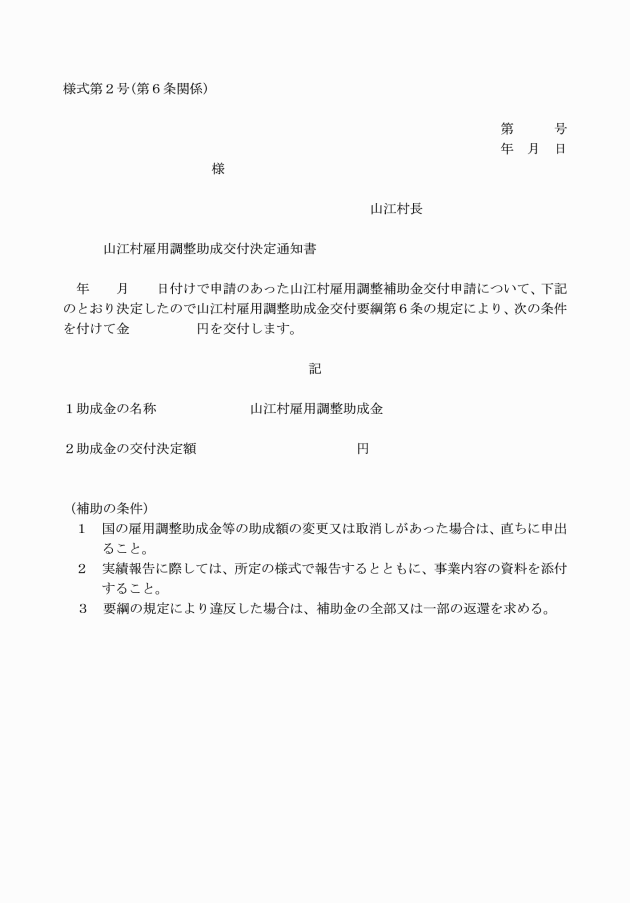 第1条 この要綱は、災害等の発生に伴い、事業活動の縮小を余儀なくされている村内事業者で、労働者に対して一時的に休業、教育訓練又は出向等を行い、労働者の雇用の維持を図った事業主に対し、予算の範囲内において助成金を交付するものとし、その交付については、山江村補助金等交付規則に定めるもののほか、必要な事項を定めるものとする。