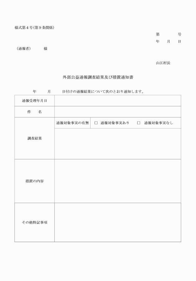 第9条 所管課は、調査結果及び措置の内容を、適切な法執行の確保、利害関係人の信用、名誉、営業上の秘密及びプライバシー等に支障を生じない限度において、外部公益通報調査結果及び措置通知書(様式第4号)により、通報者に通知するものとする。